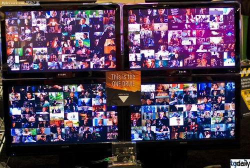第二个项目,使用四台大电视同时流输出八季的电视剧集《星际之门SG-1》,也就是256条DVD质量的视频流。当然,文件都放置在ioXtreme上,操作系统是Linux X-Windows,使用VLC播放。据说,这套系统的瓶颈并不在这块卡上,也就是如果其它部件能跟上,还可以同时传输更多视频流,超过1000条也没问题。